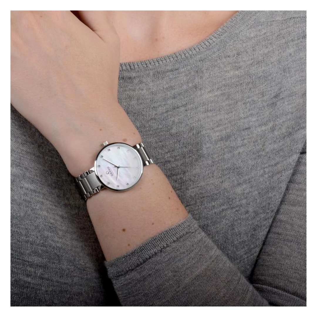 The link band bracelet is made from stainless steel with a stainless steel case that is surrounding a beautiful white mother of pearl dial with embedded Swarovski crystals - making the timepiece a feminine and modern interpretation of a classic design."