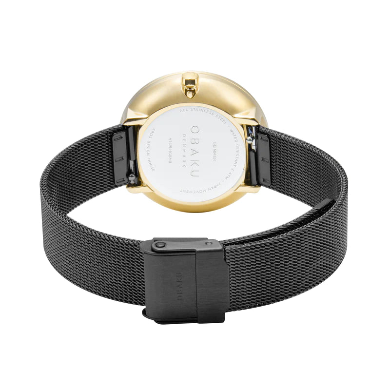 Make a bold fashion statement with the Glimmer Medallion by Obaku. This striking timepiece features a yellow-gold case and a black mesh bracelet. The sparkly black glittery dial, embellished with crystals, adds a touch of glamour to any ensemble. With its captivating design and refined aesthetics, the Glimmer Medallion embodies timeless elegance and modern sophistication.