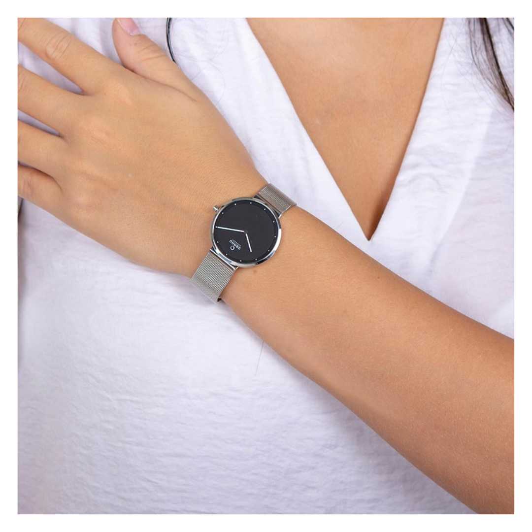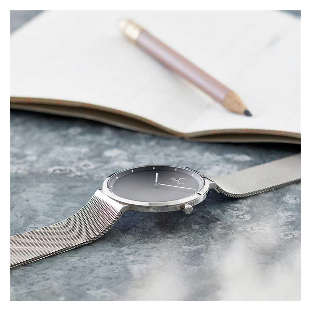 All Papir series watches are made from 316L stainless steel and scratch resistant sapphire crystal. We didn’t leave Papir Lille out of the bunch - its case and mesh bracelet are made from 316L stainless steel. We added a bit of mystery with a black dial and white hands."