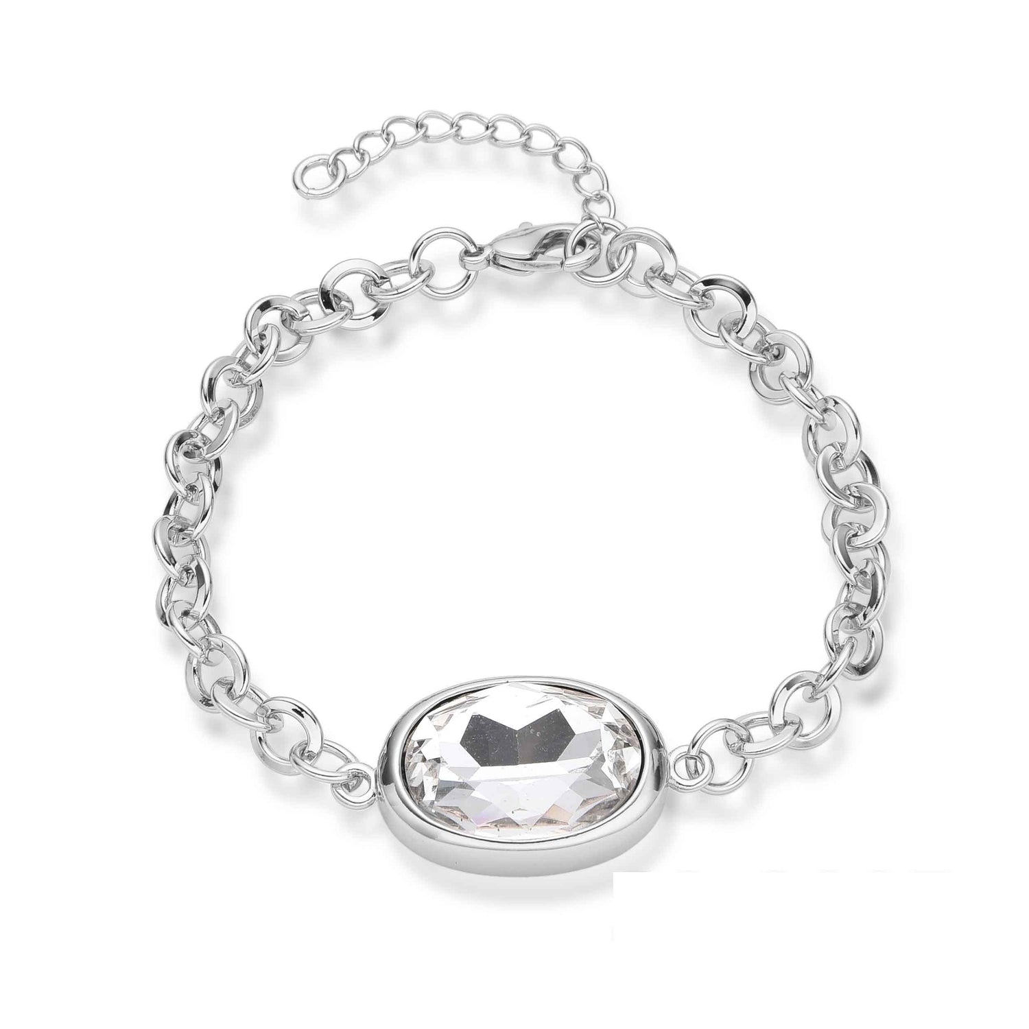 Rhodium Plated Bracelet with Large Links & Clear Crystal Charm