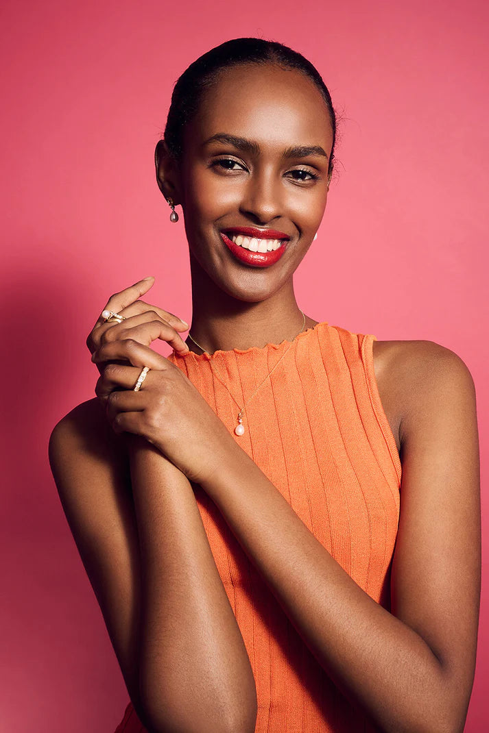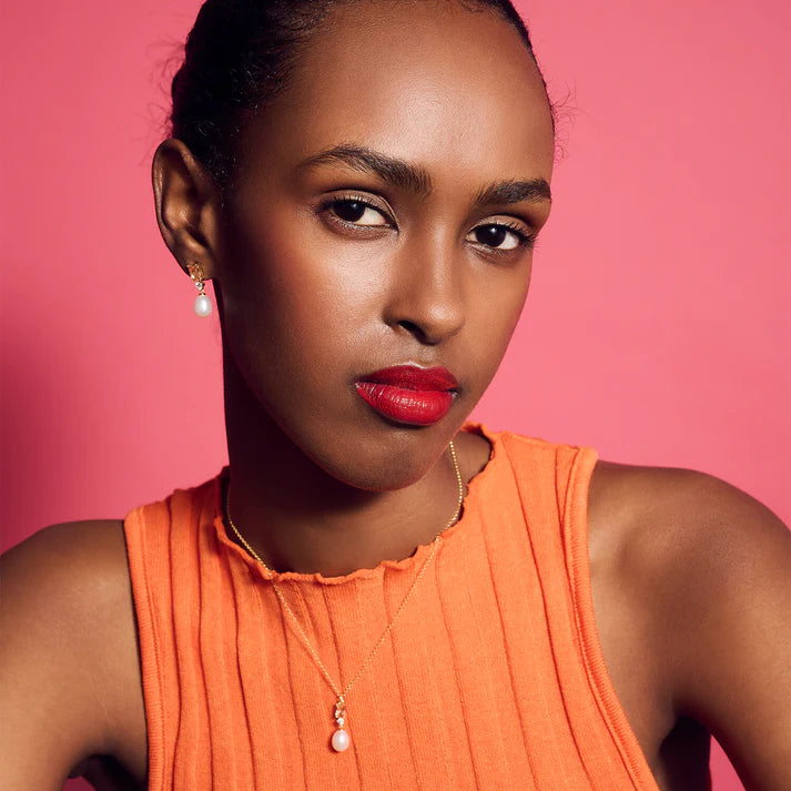 Necklace made of 18 karat gold plated 925 Sterling silver, polished surface, handset with champagne emeral cut zirconia and lustrous freshwater pearl.
